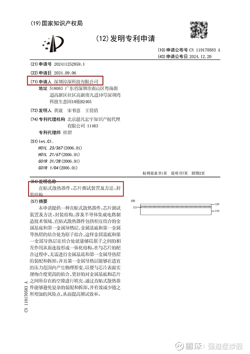 2、淳中科技子公司拥有发明专利:直贴式散热器件、芯片测试装置及方法、封