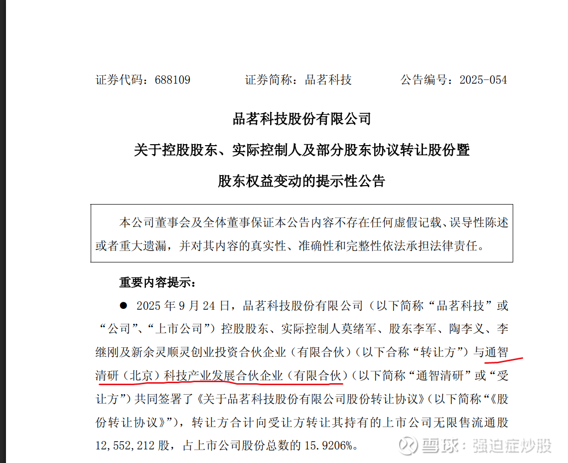 2025 年 9 月 24 日,品茗科技股份有限公司(以下简称“品茗科技”或“公司”、“上市公司”)控股股东、实际控制人莫绪军、股东李军、陶李义、李继刚及新余灵顺灵创业投资合伙企业(有限合伙)(以下合称“转让方”)与通智清研(北京)科技产业发展合伙企业(有限合伙)(以下简称“通智清研”或“受让方”)共同签署了《关于品茗科技股份有限公司股份转让协议》(以下简称“《股份转让协议》”),转让方合计向受让方转让其持有的上市公司无限售流通股12,552,212 股,占上市公司股份总数的 15.9206%。