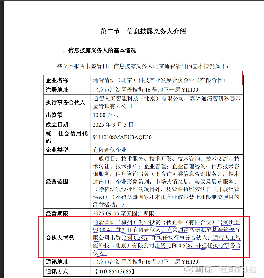 通清智研(梅州)创业投资合伙企业(有限合伙)出资比例99.00%,并担任有限合伙人;嘉兴通清智研私募基金管理有限公司出资比例 0.5%,并担任执行事务合伙人;通智人工智能科技(北京)有限公司出资比例0.5%,并担任执行事务合伙人