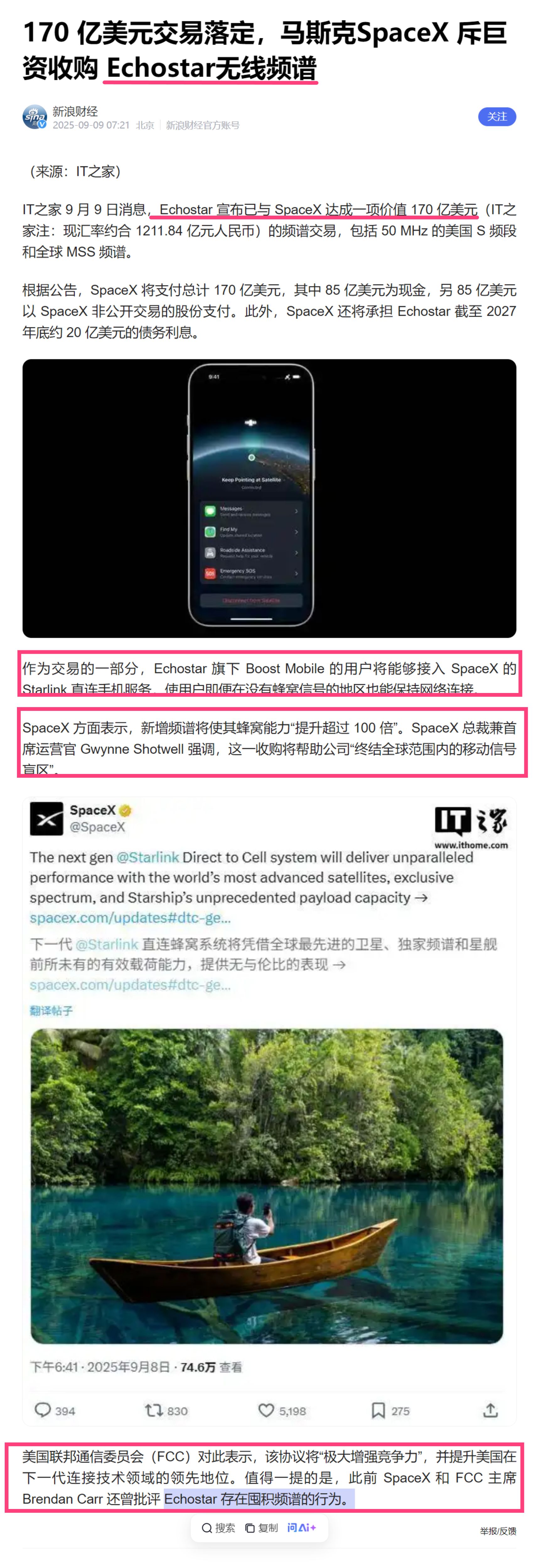 Echostar 宣布已与 SpaceX 达成一项价值 170 亿美元(IT之家注:现汇率约合 1211.84 亿元人民币)的频谱交易,包括 50 MHz 的美国 S 频段和全球 MSS 频谱。