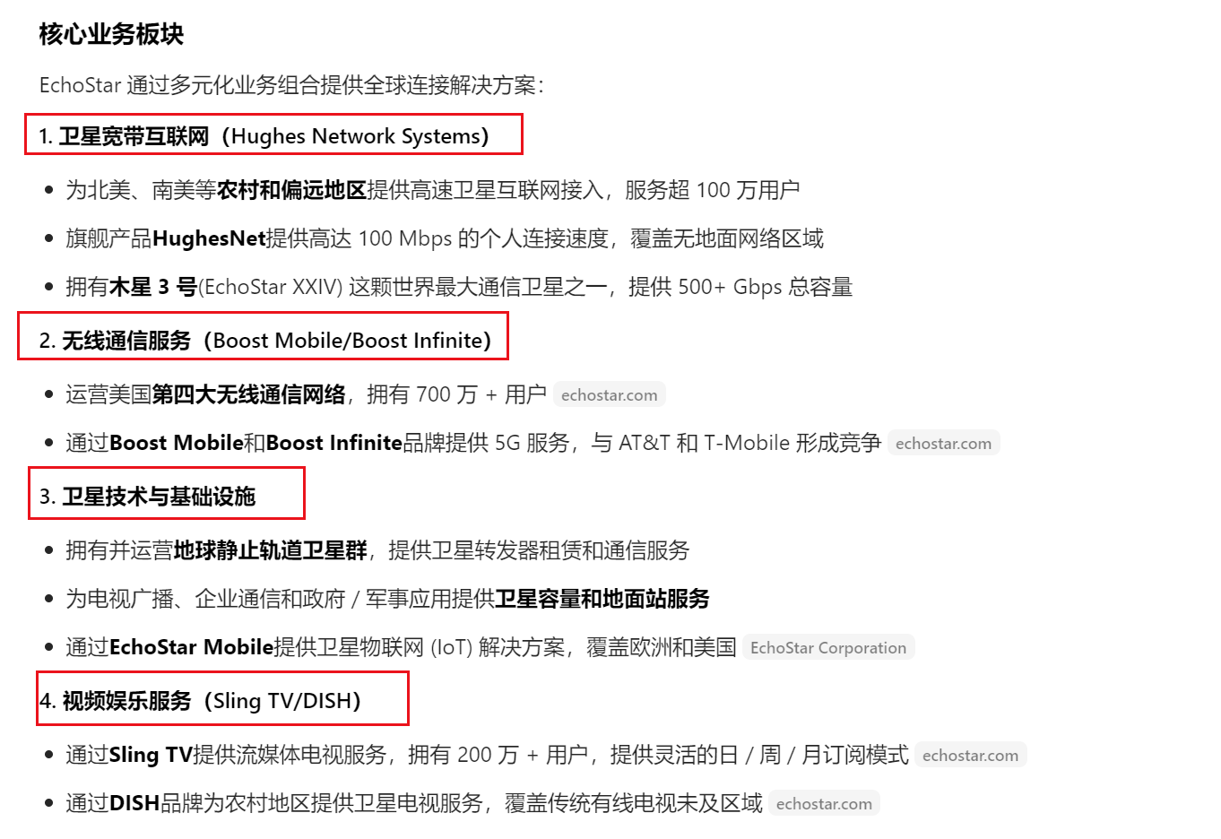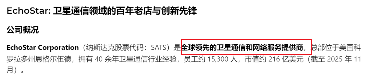 EchoStar Corporation(纳斯达克股票代码:SATS)是全球领先的卫星通信和网络服务提供商,总部位于美国科罗拉多州恩格尔伍德,拥有 40 余年卫星通信行业经验,员工约 15,300 人,市值约 216 亿美元(截至 2025 年 11 月)。