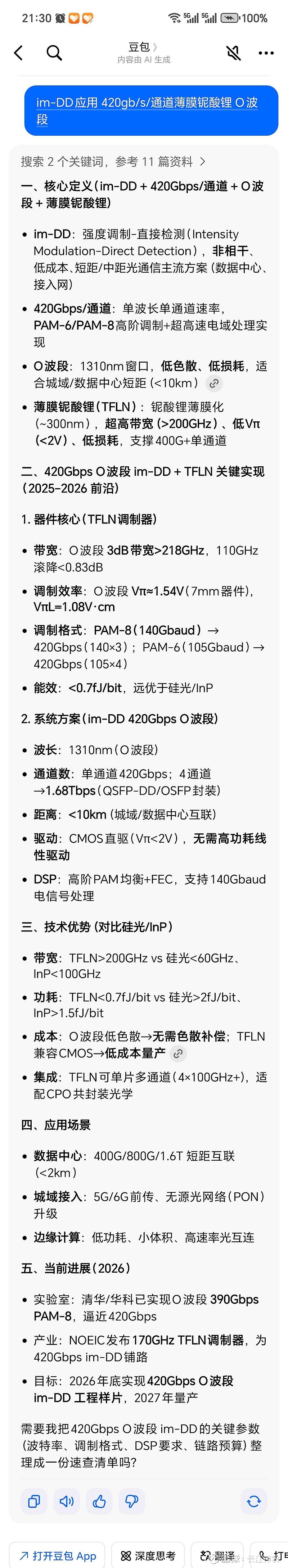 IM-DD应用 420Gb/s/通道薄膜铌酸锂 O波段:数据中心互联、城域接入、边缘计算推理!!