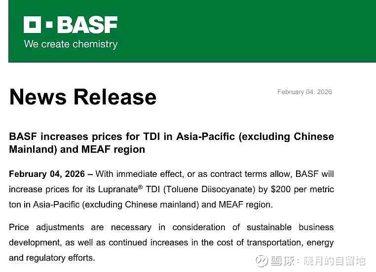 根据巴斯夫2月4日信息,巴斯夫上调亚太地区(不含中国大陆)及MEAIF区域TDI价格。2026年2月4日,即刻生效或根据合同条款规定,巴斯夫将在亚太地区(不包括中国大陆)和MEAF地区对其Lupranate TDI(甲苯二异氰酸酯)产品的价格每公吨上调200美元。本次上调主要是考虑到可持续业务发展以及运输、能源和监管成本的持续上涨,价格调整是必要的。