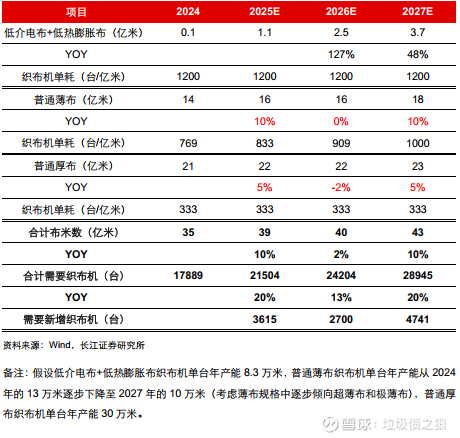 织布机跟随需求变化,但总量和结构调整速度均慢。近年来电子布行业需求呈现从厚布转向薄布的趋势,一是下游应用领域对传输性能提高,二是 AI需求爆发大幅增加薄布需求。在此需求变化背景下,织布机供给同步调整:一是普通薄布转产AI电子布,二是电子布从较厚规格向更薄规格转产。但单台织布机从厚规格转向更薄规格后,生产效率大幅下降,比如厚布织布机的年产能约30万米/台,低介电薄布织布机的年产能为8.3万米/台,薄布织布机的单台效率较厚布织布机下降约2/3。
