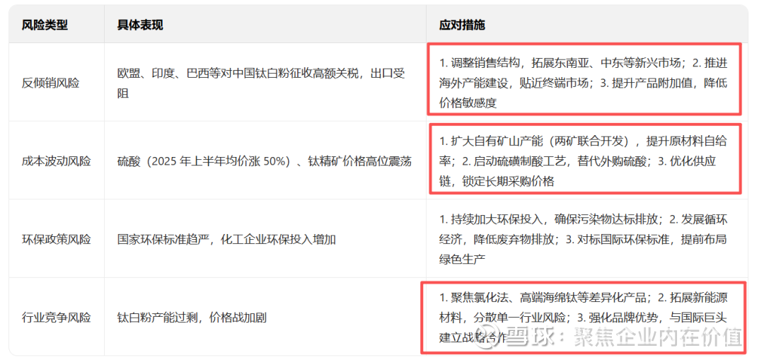 竞争焦点从 “规模扩张” 转向 “技术壁垒 + 市场多元化”,氯化法钛白粉因环保、性能优势,占比逐步提升(公司氯化法产能占比约 14.5%),海外反倾销倒逼企业 “产能出海”。