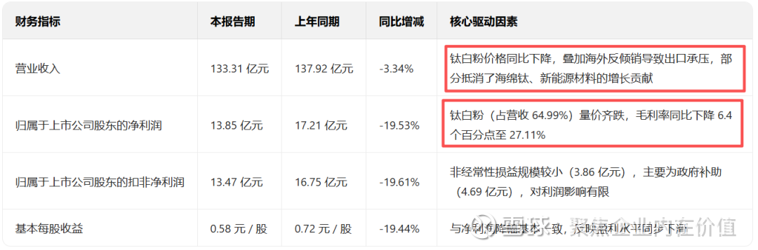 钛白粉行业供给宽松 + 海外反倾销双重压力下,上半年价格先涨后跌,二季度受欧盟(每吨征 700 余欧元)、印度(每吨征 400 余美元)等反倾销税影响,出口量同比降 10.78%,国内市场竞争加剧。公司凭借成本优势(全产业链 + 硫氯耦合技术),氯化法钛白粉仍维持盈利,但整体板块营收 86.64 亿元(-7.68%),毛利率 27.11%(-6.4 个百分点)。