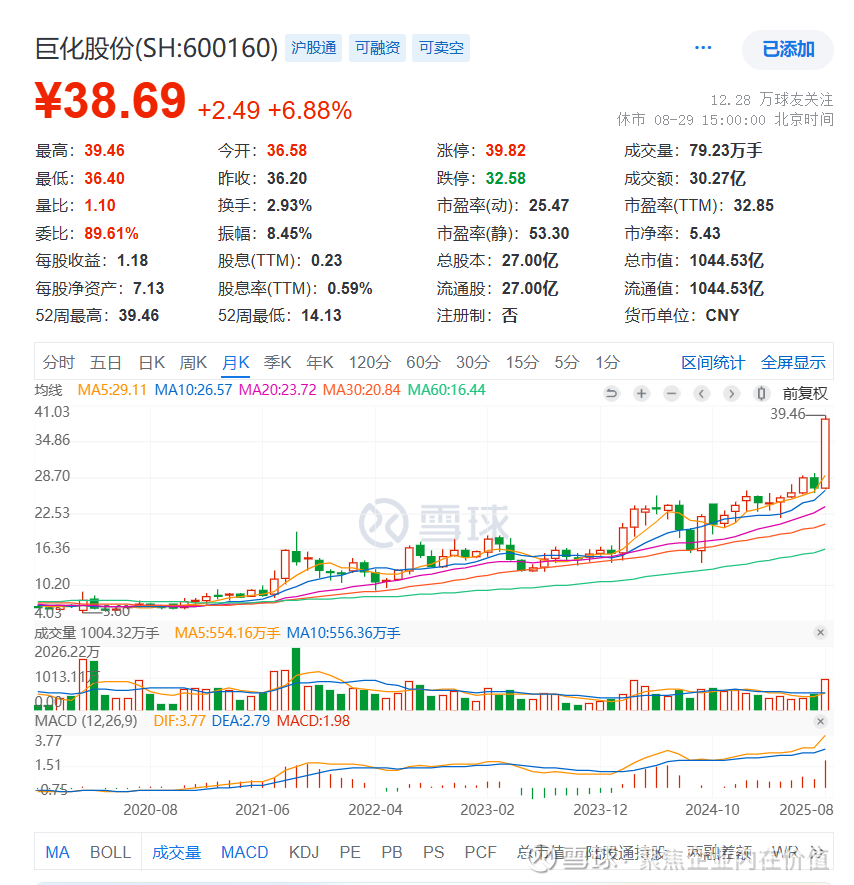 当前是2025年8月31日,股价是38.69元,市值是1044.53亿元,市净率是5.43倍。