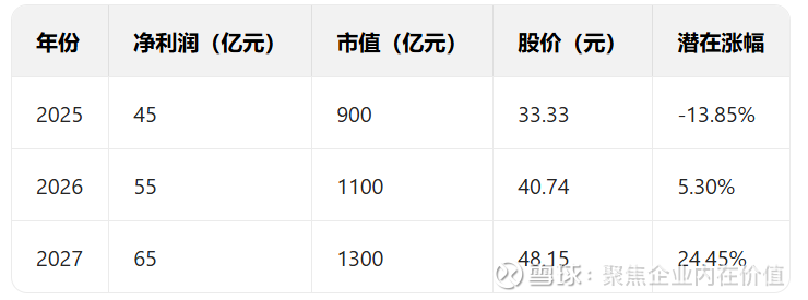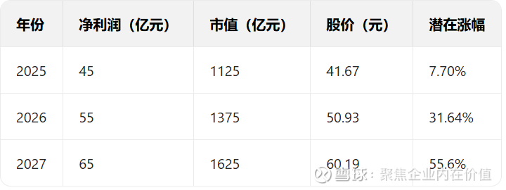 当然如果这个估算到2027年70亿的话,那么给25倍的话,潜在涨幅67.54%。那么还可以看。如果是按照20倍的话,70亿元利润,就是潜在34%涨幅。如果是按照25倍,70 亿的话,潜在涨幅67.5%