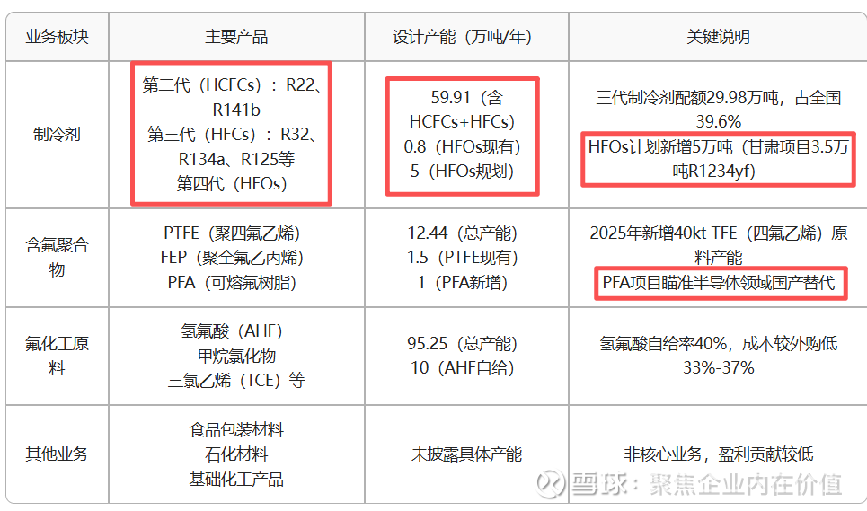 产能与技术壁垒高公司拥有完整氟化工产业链,从萤石、无水氟化氢等原料到制冷剂、含氟聚合物等终端产品一体化布局,且在第四代制冷剂(HFOs)领域已形成先发优势 —— 现有两套 HFOs 生产装置(产能约 8000 吨 / 年),计划通过新建 + 技改新增产能近 5 万吨,为应对未来 HFCs 削减储备技术与产能。