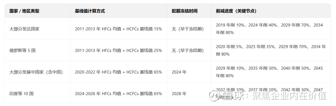 全球范围内,三代制冷剂(HFCs)受《基加利修正案》管控,各国配额已冻结或进入削减周期,企业无法自主扩产,具体政策节奏如下表: