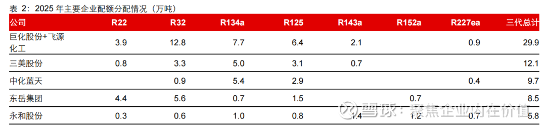 高集中度格局2025 年中国制冷剂行业 CR3(头部 3 家企业份额)达 66%,细分品种集中度更高 ——R32(空调主力)CR3 78%、R134a(车用)CR3 87%、R143a(混配)CR3 92%。