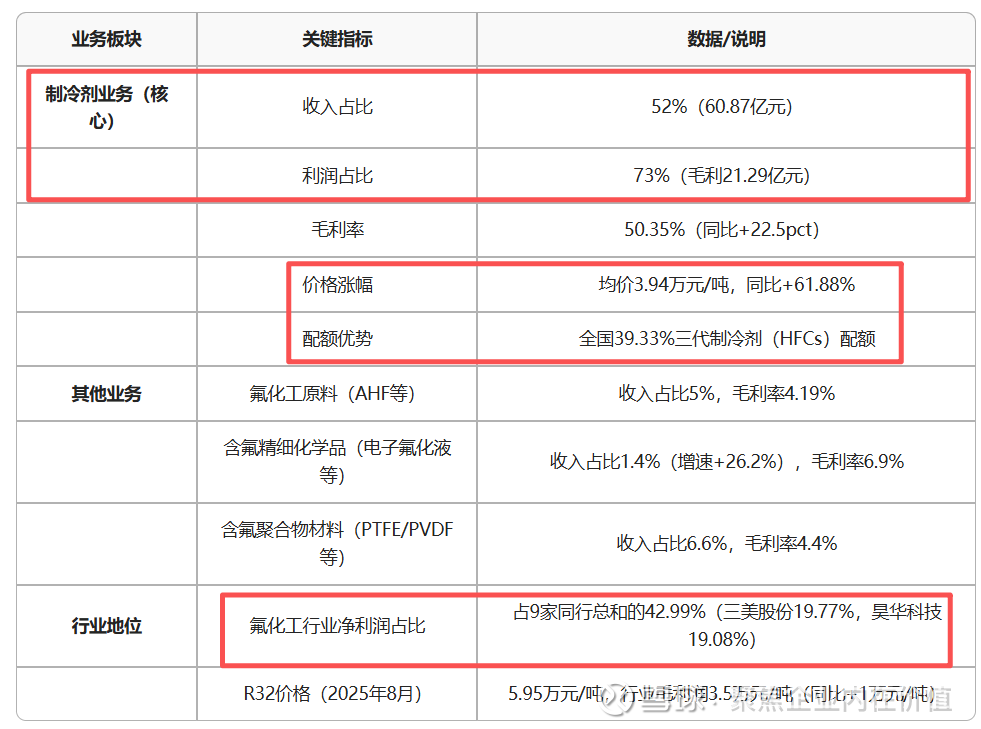 公司业务涵盖氟化工原料、制冷剂、含氟聚合物材料、含氟精细化学品等多个领域,2025 年上半年各业务板块表现分化,制冷剂业务贡献核心增量: