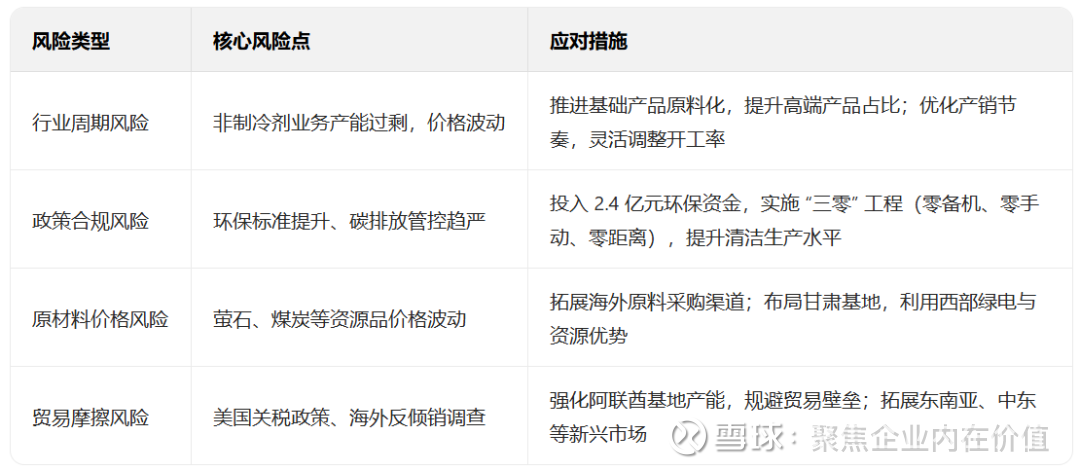 行业竞争风险非制冷剂业务(如石化材料)仍面临化工行业 “内卷式” 竞争,价格承压。