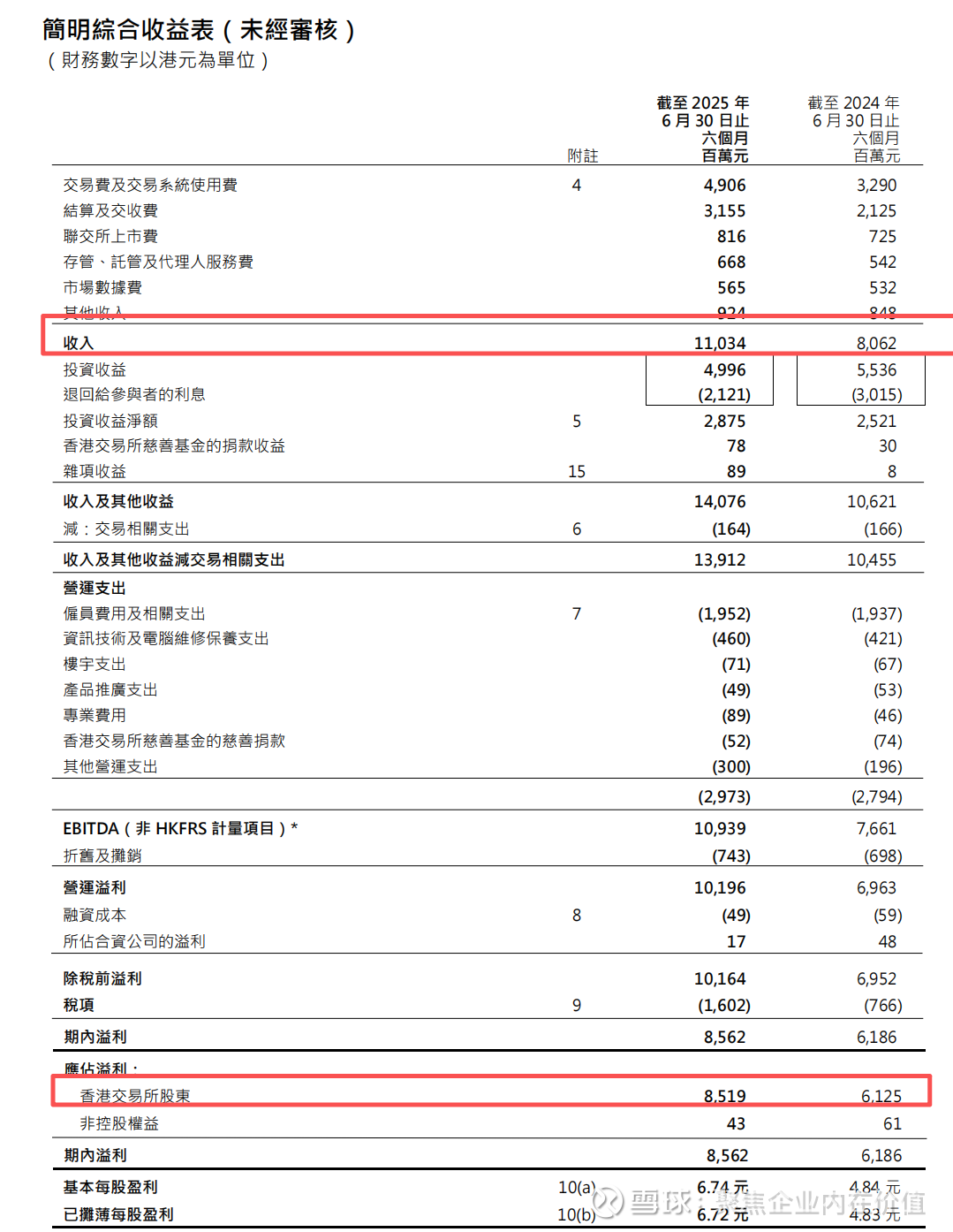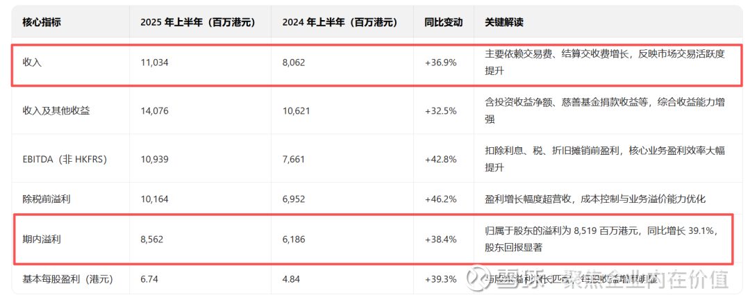2025 年上半年,香港交易所核心财务数据同比均实现正向增长,盈利质量与股东回报能力突出,具体关键指标如下表所示: