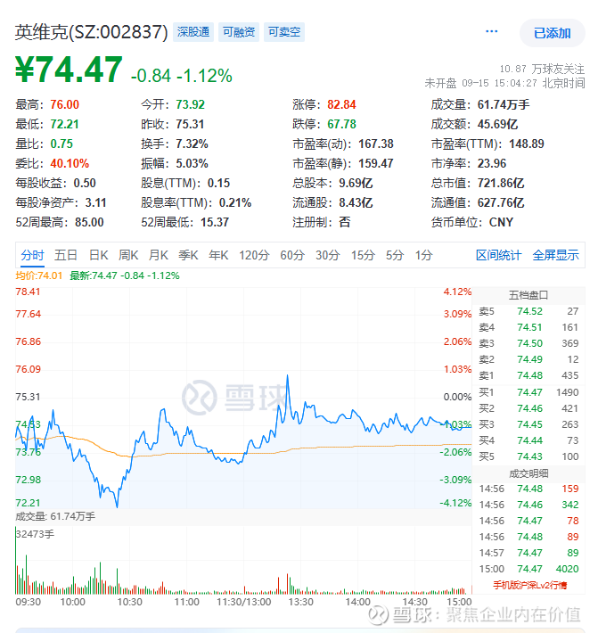 2025年9月16日上午9点,当前的股价是74.47元,市净率 23.96倍,市值是721.86亿元。