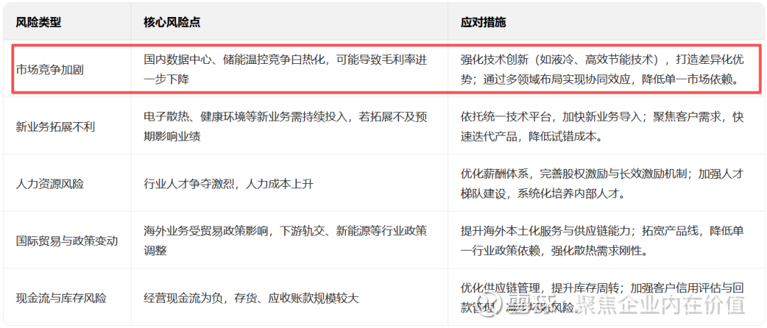市场竞争加剧液冷、储能温控领域新进入者增多,若技术迭代滞后可能导致份额下滑;