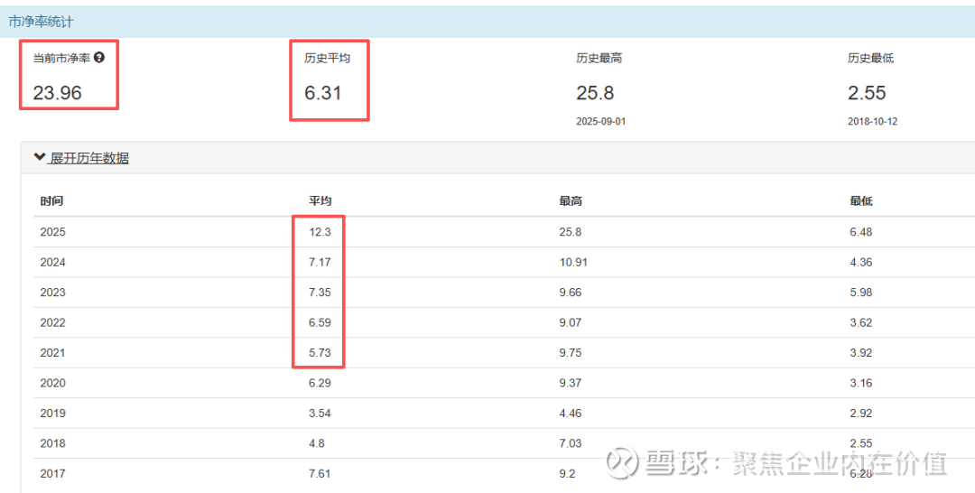 历史平均市净率是6.31倍,当前是23.96倍,肯定是贵的。这个不必说。