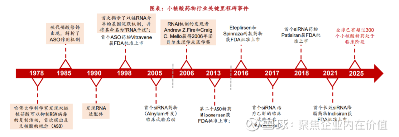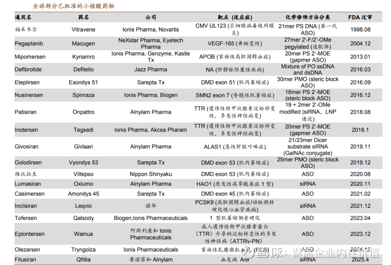 1.小核酸赛道正掀起“第三波”创新浪潮,全球市场规模实现快速增长。 作为继小分子药物、抗体药物之后的 “第三波” 创新浪潮,小核酸药物具备靶点 覆盖广、研发迭代空间大、特异性高、作用效果持久、临床试验成功率更高、临 床开发速度快等显著优势。小核酸药物主要包括小干扰 RNA(siRNA)、反义小 核酸(ASO)和适配体(Aptamer)。根据医药魔方数据库显示,截至 2025 年 12 月 3 日,全球共有 23 个小核酸药物上市(包括撤市产品),其中 14 款为 ASO 药物、7 款为 siRNA 药物、2 款为 Aptamer 药物。根据弗若斯特沙利文统 计,全球小核酸药物市场增长强劲且持续,从 2019 年的 27 亿美元增长至 2024 年的 57 亿美元,复合年增长率达 16.2%。随着 GalNAc 递送技术从肝靶向到肝 外靶向的持续突破、上市批准与临床验证的稳步推进、适应症的持续拓展、政策 的大力支持等多重因素共振,预计全球小核酸药物市场将加速扩容,2034 年市 场规模有望达到 549 亿美元。其中,siRNA 药物市场占比从 2019 年的 6.2%提 升至 2024 年的 44.5%,未来有望继续保持强劲增长势头。