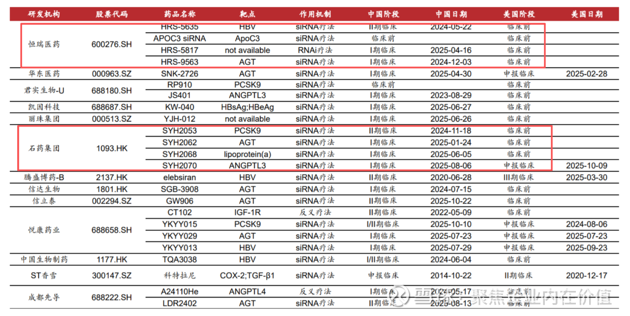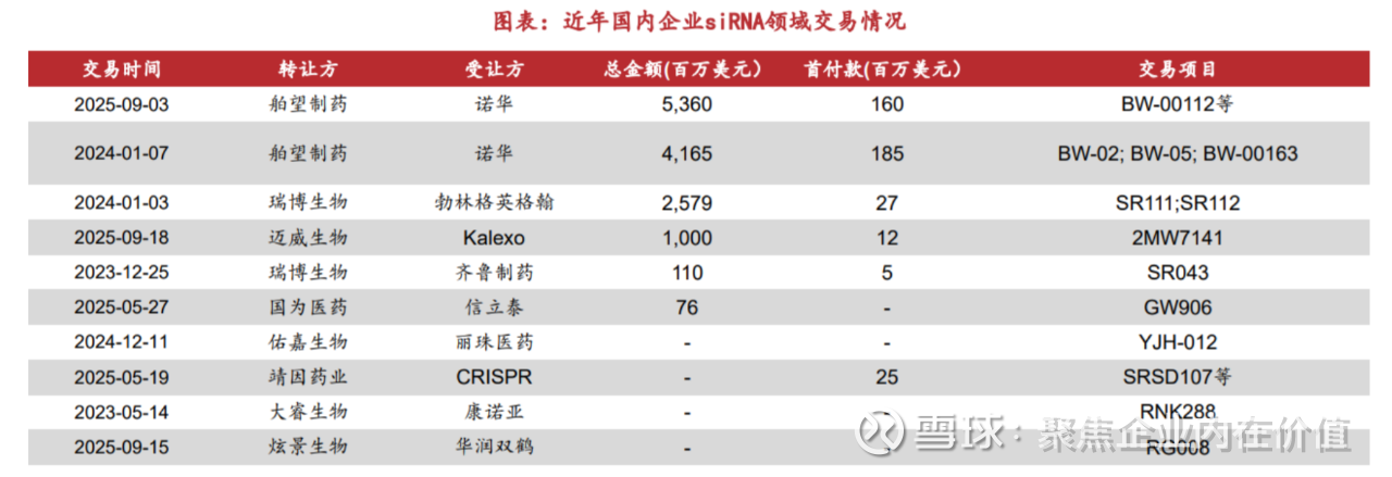 5..国内 siRNA 领域交易情况 近年来,国内 siRNA 药物领域的 BD 交易快速升温。 1)头部 Biotech 崛起:2024 年 1 月,瑞博生物与勃林格殷格翰就 MASH 药物达成超 20 亿美元合作; 舶望制药先后于 2024 年 1 月及 2025 年 9 月与诺华达成重磅交易,两次合作交易总额合计超 95 亿美元, 成为中国 siRNA 领域国际化合作的标杆案例;2025 年 5 月,靖因药业与 CRISPR 合作开发血栓治疗 siRNA 药物 SRSD107,9500 万美元首付款及超 8 亿美元里程碑付款。 2)慢性病传统成熟药企或 Biopharma 通过 BD 或者战略合作布局:信立泰、信达生物、齐鲁制药、 华东医药等通过引进或联合开发加速布局,如齐鲁制药以超 7 亿元引进瑞博生物 PCSK9 管线。此外, 恒瑞医药、石药集团等头部药企自建技术平台,推动国产 siRNA 管线进入临床阶段。