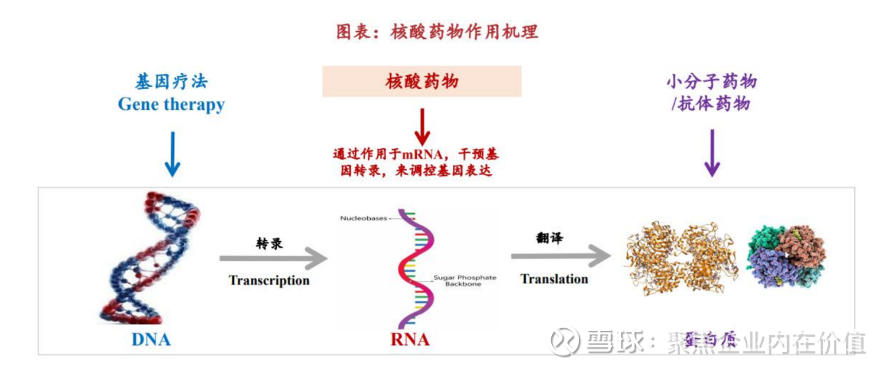 核酸药物含义:核酸是所有生命体遗传信息的载体,包括脱氧核糖核酸(DNA)和核糖核酸(RNA)两 大类。随着分子生物学的发展,人们发现除编码蛋白质的核酸序列外,还大量存在非编码序列对人体的 生命活动发挥着重要的调控作用。利用核酸分子的翻译或调控功能,作为干预疾病的药物,即为核酸药 物。 与传统的小分子药物和抗体药物相比,核酸药物能够在 mRNA 转录时进行干预,抑制疾病相关基因表达为病理性蛋白,或引入能够表达正常蛋白的基因弥补功能蛋白的不足,具有“治标治本”的特点。