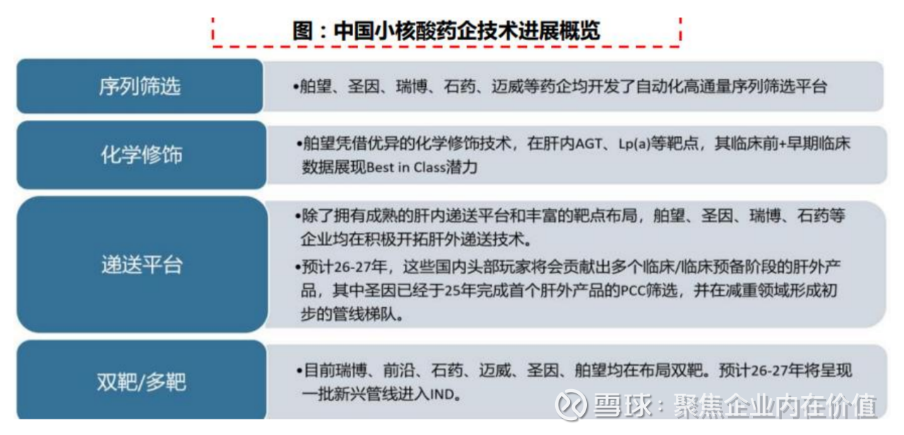 国内小核酸药企正处于新兴发展阶段,肝内肝外递送技术平台国内外无明显代际差。虽然中国小核酸公 司成立晚于美国,但从人才资源上看,中国小核酸头部公司创始团队大多具备丰富的产业经验和海外龙 头公司研发经验。小核酸领域中的化学修饰、递送系统组合构建也正是中国科学家、工程师擅长的。基 于目前肝内递送的技术成熟,中国小核酸药企已实现肝内靶点的较广覆盖,并凭借优异的化学修饰等能 力在近两年孕育出全球 FIC、BIC 产品,其中舶望已经和诺华在近两年完成两单 BD。放眼蓝海的肝外 靶点,中美在肝外递送技术上位于相似的起跑线上,没有明显代际差。