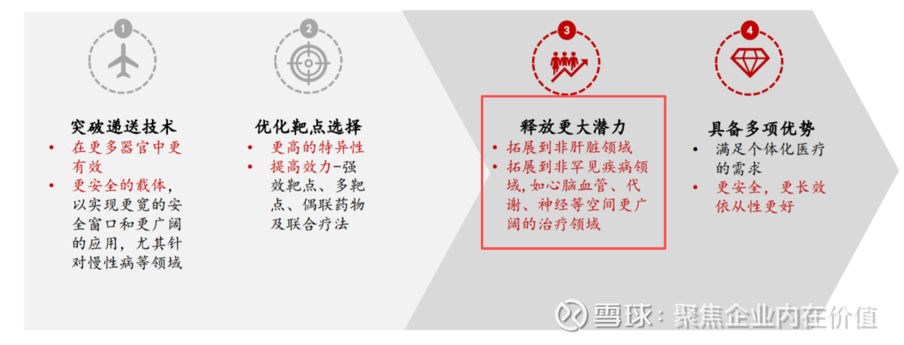 10.小核酸药物未来发展趋势。小核酸药物未来有望在递送平台以及靶点选择方面取得突破性进展,释放出较大的市场潜力。具体发展 方向包括:选择经过验证的具有更高特异性和效力的靶点,探索更多传统不可成药靶点;实现更高效、 安全的递送,优化非肝脏特异性的递送平台(靶向肌肉、中枢神经系统、脂肪等组织);拓展到非罕见疾病领域,如心脑血管、代谢、神经、肿瘤等治疗领域。