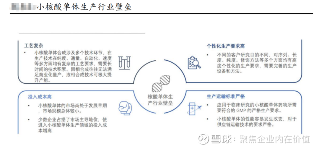 3.随着小核酸药物商业化品种增加,小核酸产业链上游及 CDMO 有望持续受 益;小核酸药物上游原材料包括单体和试剂,通常包括核苷酸单体、 Detritylation(去三苯甲基保护基)试剂、活化剂、保护基试剂、耦合试剂、 清洗剂、脱保护剂、硫化试剂、纯化试剂等。其中小核酸单体是上游的重要 原材料之一,往往在合成后需要进行一定的化学修饰,化学修饰将直接影响 小核酸药物的稳定性;此外小核酸单体其工艺复杂、投入成本较高,生产运 输技术的标准要求严格,因此具有较高的生产壁垒。临床阶段小核酸单体无需量产,随着商业化阶段的药物逐渐增加,小核酸单体需求有望进入快速发 展阶段;CMC 及 CDMO 需求亦有望迎来爆发。