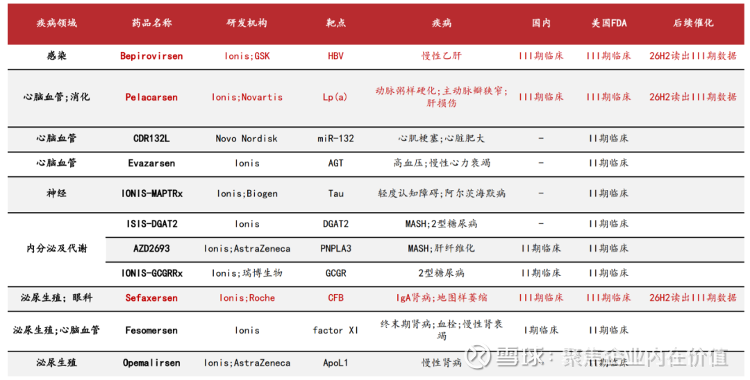 26.Ionis:2026 年催化众多,迎来产品和商业化兑现关键阶段 Ionis 主要产品进展情况梳理如下,(1)Olezarsen:FCS 适应症已获批,25 年 9 月 披露 Olezarsen sHTG 阳性结果,预计 26 年该适应症获批。(2)Zilganersen:亚历山大 病预计 2026 年获批。(3)Bepirovirsen(与 GSK 合作):治疗 HBV,预计 26 年披露数 据,年底有望获批。(3)Pelacarsen(与诺华合作):lp(a)降脂药,预计 26 年披露数 据,26 年底 or27 年初获批。 关键三期数据读出:(1)Eplontersen:CARDIO-TTRansform data (ATTR-CM);(2) Sefaxersen(CFB):IMAGINATION data(IgAN),罗氏合作。