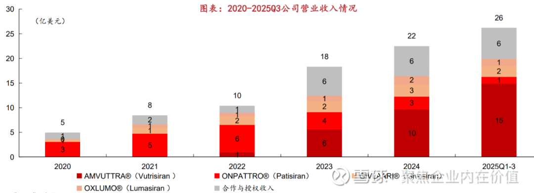 公司布局五大领域,包括TTR淀粉样变、罕见病、心血管、代谢、神经系统疾病。目前有上市药物6款,进入III期临床的药物5款。其中 在Amvuttra药物于25年3月新增ATTR-CM适应症后,在研Nucresiran药物也在25H1开启ATTR-CM的临床III期试验。