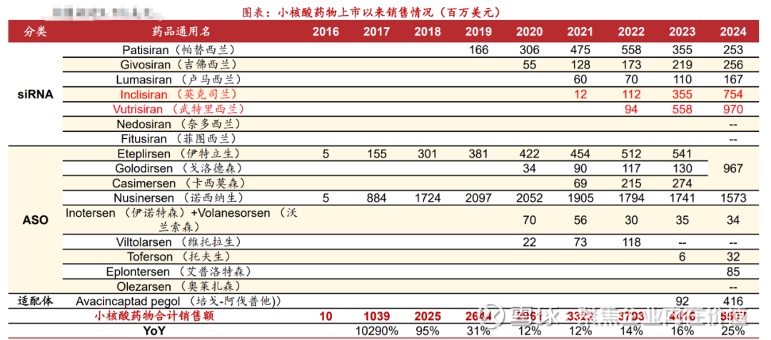 1.适应症从罕见病扩展至慢病领域,小核酸药物市场潜力可期;小核酸药物 是由十几个到几十个核苷酸串联组成的短链核酸,目前小核酸药物主要包 括 RNAi 和 ASO 药物,作用于 pre-mRNA 或 mRNA。根据医药魔方,全球已获 批上市的小核酸药物有 23 款,其中早期主要集中在罕见病领域,自诺华 &Alnylam 合作开发的 Inclisiran 获批以来,逐渐向慢病领域扩展。 Inclisiran 销售额增长迅速,2022 年销售额为 1.12 亿美元,截至 2025Q1- Q3 销售额达 8.63 亿美元,同比增长 61%,预计全年有望突破 10 亿美元, 由此可见,小核酸药物在慢病领域市场潜力可期。