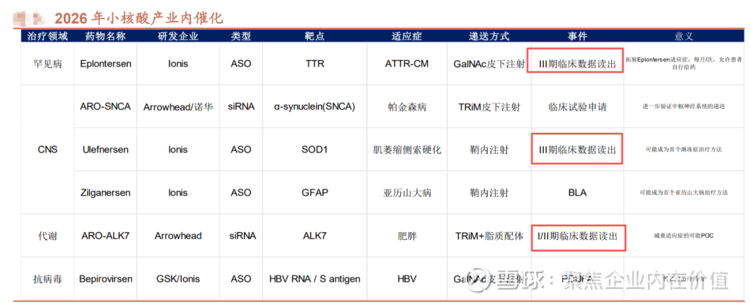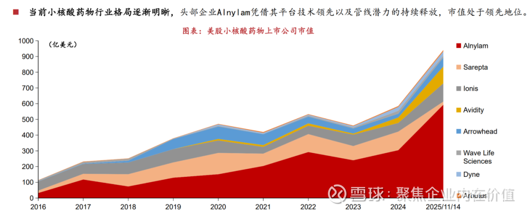 24.2025 年为小核酸药物行业持续爆发的一年,简单梳理近一年的小核酸重大事项,我 们发现在小核酸已经确定性进入商业化兑现周期和新平台验证周期中,无论是美股小核 酸公司还是 A/港股小核酸相关公司都有望在未来迎来极佳的投资机会。 商业化层面:(1)由于 AMVUTTRA 销售增长迅速,Alnylam 公司连续两个季度持 续上调公司 25 年全年业绩预期。(2)2025 年 9 月,Ionis 宣布其 ASO 产品 Olezarsen 针 对 sHTG 关键性 3 期 CORE 和 CORE2 研究,Olezarsen 可使患者的空腹甘油三酯相较安 慰剂平均降低 72%,急性胰腺炎事件减少 85%,消息公布当天,公司股价大涨近 35%。 Olezarsen 将成为 lonis 旗下首款面向广泛人群的 ASO 疗法,将其适应症范围从罕见的常 染色体隐性遗传病 FCS 拓展至常见的代谢性疾病 sHTG(美国患者约 300 万名),商业化前景巨大。(3)2025 年 11 月 18 日,Arrowhead 宣布其 RNAi 疗法普乐司兰钠注射 液(Plozasiran)的新药上市申请,可作为饮食疗法的辅助手段,用于降低家族性乳糜微 粒血症(FCS)成人患者的甘油三酯水平。这也标志着 Arrowhead 首个商业化产品成功 上市。