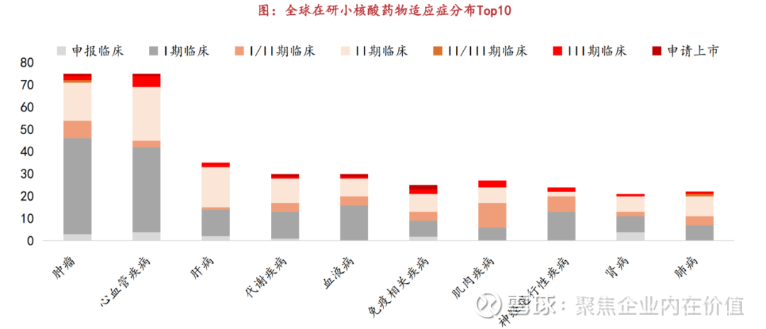 14.小核酸药物临床适应症分布广泛,肿瘤与心血管/肝病/代谢领域研发热度较高。
