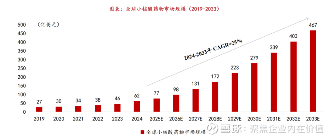 全球小核酸药物市场增长强劲,市场规模从2019年的27亿美元增长至2024年的62亿美元,预计2033年有望达到467亿美元,2024-2033年 复合年增长率达25%(来自弗若斯特沙利文报告)。