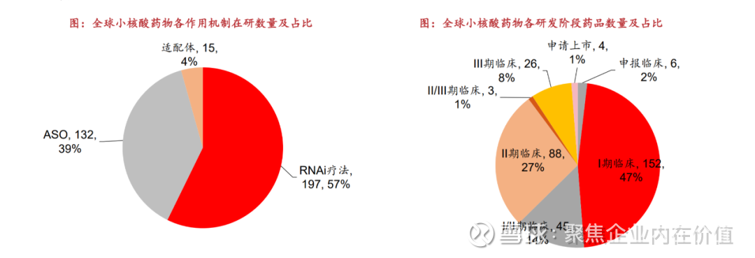 从作用机制来看:1)RNAi疗法占据主导地位,在研药物数量占比为57%;2)ASO和适配体在研药物数量占比分别为39%和4%。