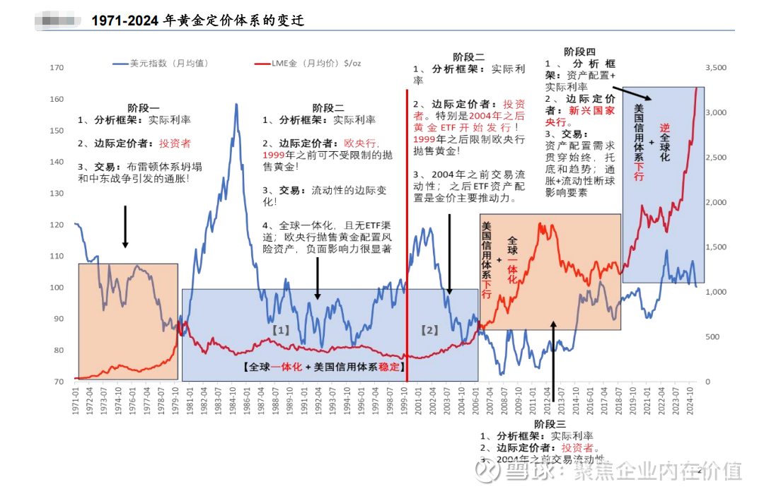 1970-2024 年历次黄金上涨大周期中,全球经济大变局往往强化特定要素,催生新的边际买家,重塑黄金投资框架。