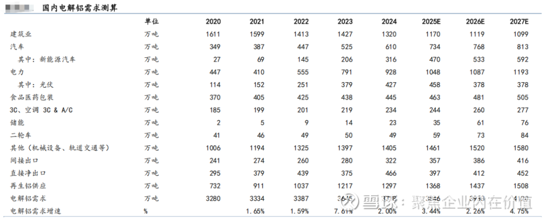 预期国内电解铝需求 26 年同比增速 2.3%,国内 27 年需求增速或修复至 4.8%。在经历今年以来光伏、汽车等领域国内铝需求持续超市场预期后,当前市场对于明年的电解铝需求预期依旧偏保守,核心逻辑是认为铝下游传统需求中缺乏相对具有亮点的细分行业,且光伏、地产以及汽车或有拖累的可能。而根据我们的测算,即使在假设光伏装机量、传统汽车产量增速假设保守情境下,依靠新能源汽车及电网等高景气度领域的需求拉动,国内电解铝 26 年同比需求增速仍有 2.3%。而 27 年来看,由于光伏、建筑的拖累在明显修复,国内电解铝需求在 27 年增速或提升至 4.8%。