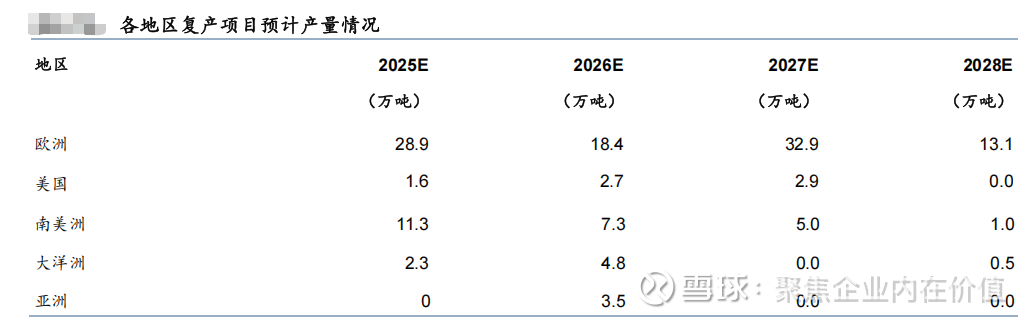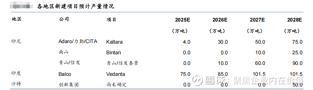 耗电力供给约束,复产进展同样缓慢,仅世纪铝业 Mt Holly 项目存在复产预期。预计2025–2027 年美国新增产量分别为 1.6 万吨、2.7 万吨、2.9 万吨,合计约 7.2 万吨。其他地区复产项目整体进度平稳,预计南美洲、大洋洲和亚洲 2025/2026/2027 合计新增 13.6万吨/15.6 万吨/5.0 万吨产量。