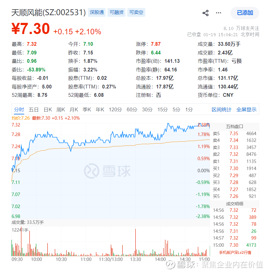 当前的天顺风能 7.30元,市值131.17亿元,1.46倍市净率。