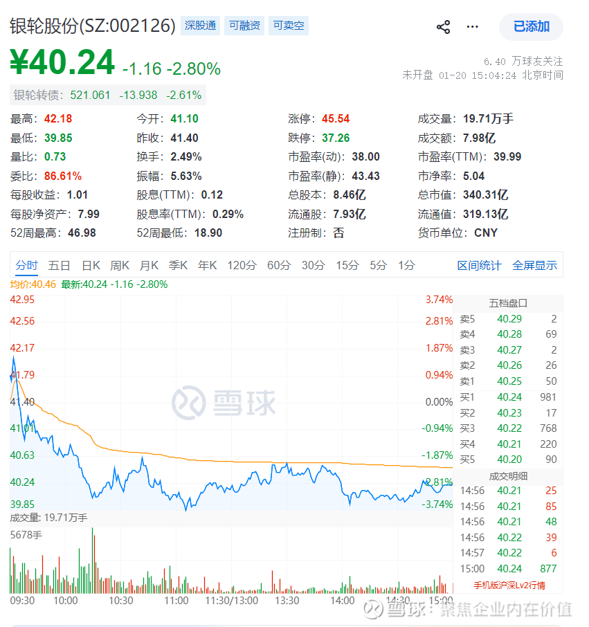当前的价格是40.24元,市值是340.31亿元,市净率是5.04倍