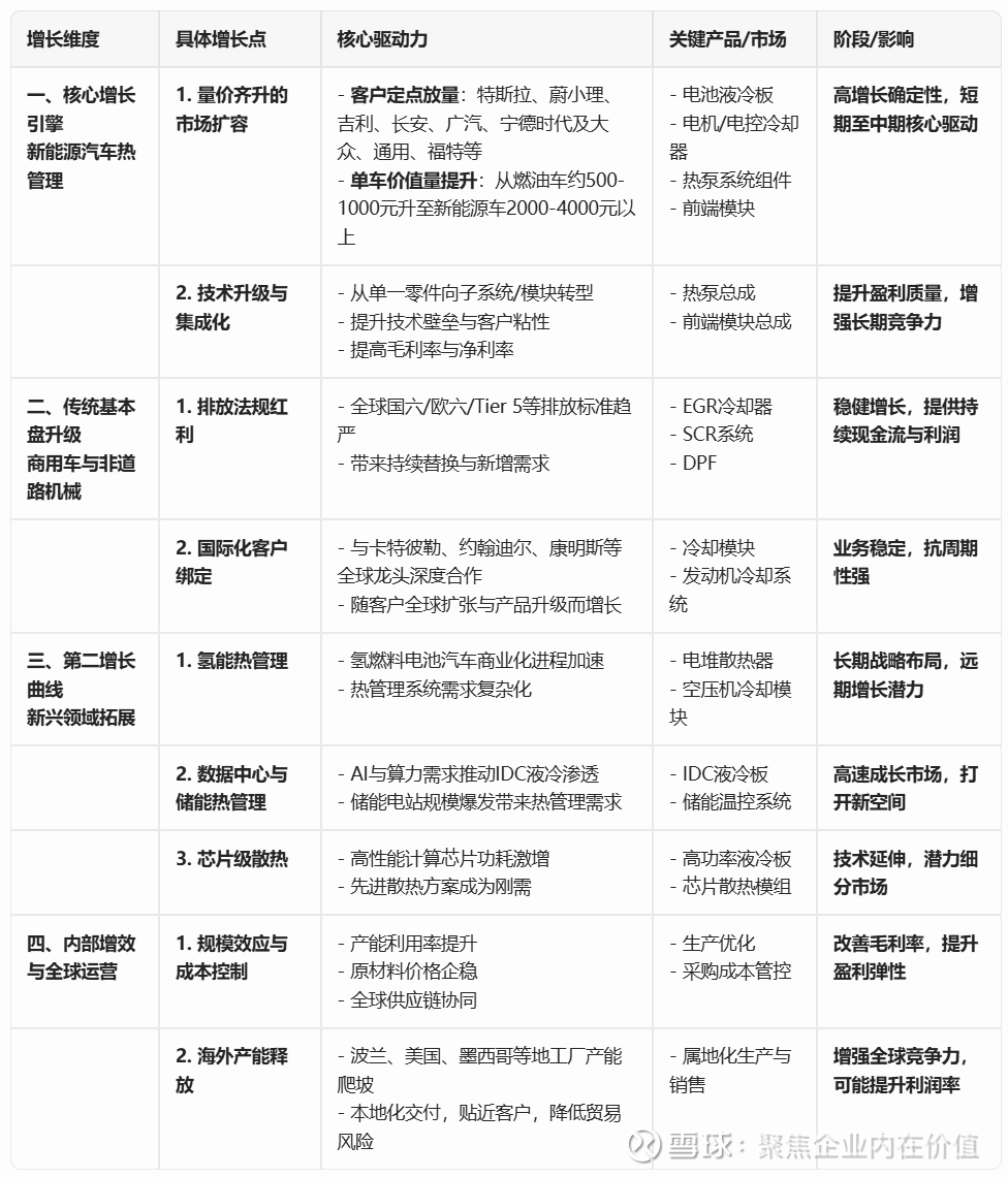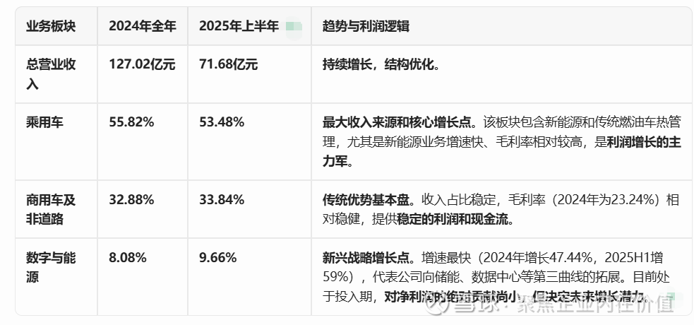 第二利润支柱(稳定基本盘):商用车及非道路热管理业务。拥有高毛利率和深厚的客户基础,提供稳定的现金流和利润,是公司业绩的“压舱石”。
