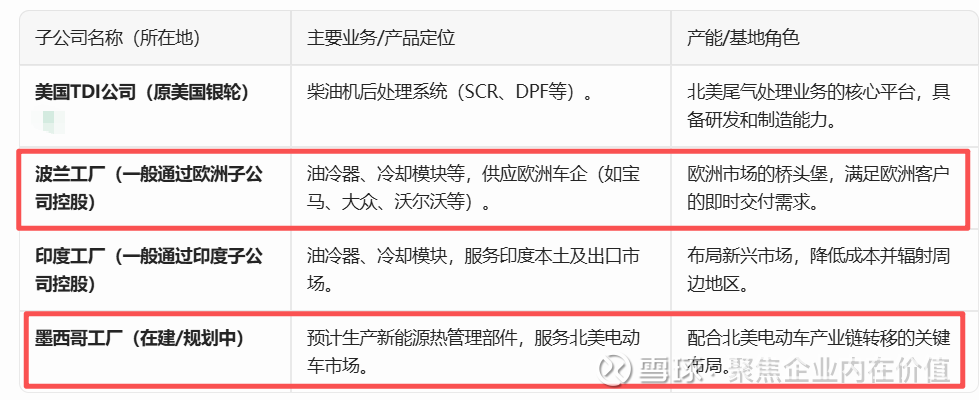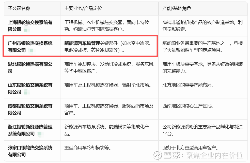 银轮股份核心的制造业子公司(即重要的非贸易、非投资类生产型子公司)主要如下。这些子公司是公司实现“热交换器、尾气处理、热管理”三大业务板块全球布局和属地化生产的核心载体。