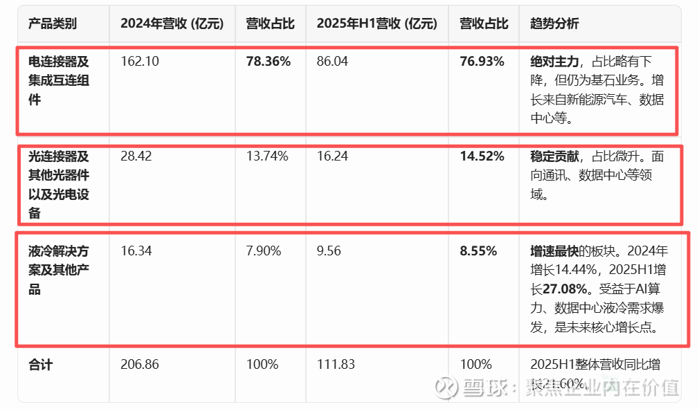 这是理解公司业务构成最清晰的维度。整体呈现出 “电连接器为主、光器件稳增、液冷方案高速增长” 的格局。