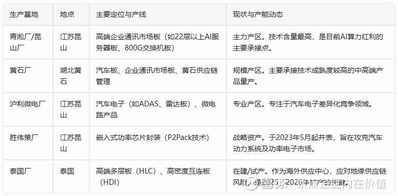 评估: 沪电股份目前的产能策略非常明确——将高溢价的AI和数据中心板集中在技术底蕴最深的昆山青淞厂,将汽车电子和规模化产品分布在黄石和沪利微电,并通过泰国工厂实现海外交付能力的跨越 。公司目前的利润高度依赖昆山青淞厂的高端产能,同时正通过黄石厂和泰国厂进行规模与地域的扩张。