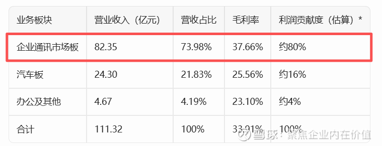 核心业务板块: 企业通讯市场板是公司最主要的盈利来源。2024年该业务营业收入达 82.35亿元,占总营收的约74%,毛利率高达 37.66% (对比汽车板毛利率为25.56%)。