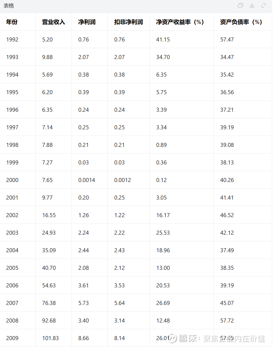 从这个表上看,营收年化复合增速在22年间是可以的,净利润年化复合增速略低一些 9.35%,资产收益率平均值是11.32%,能看,资产负债率有点儿高,应该是行业属性的问题。