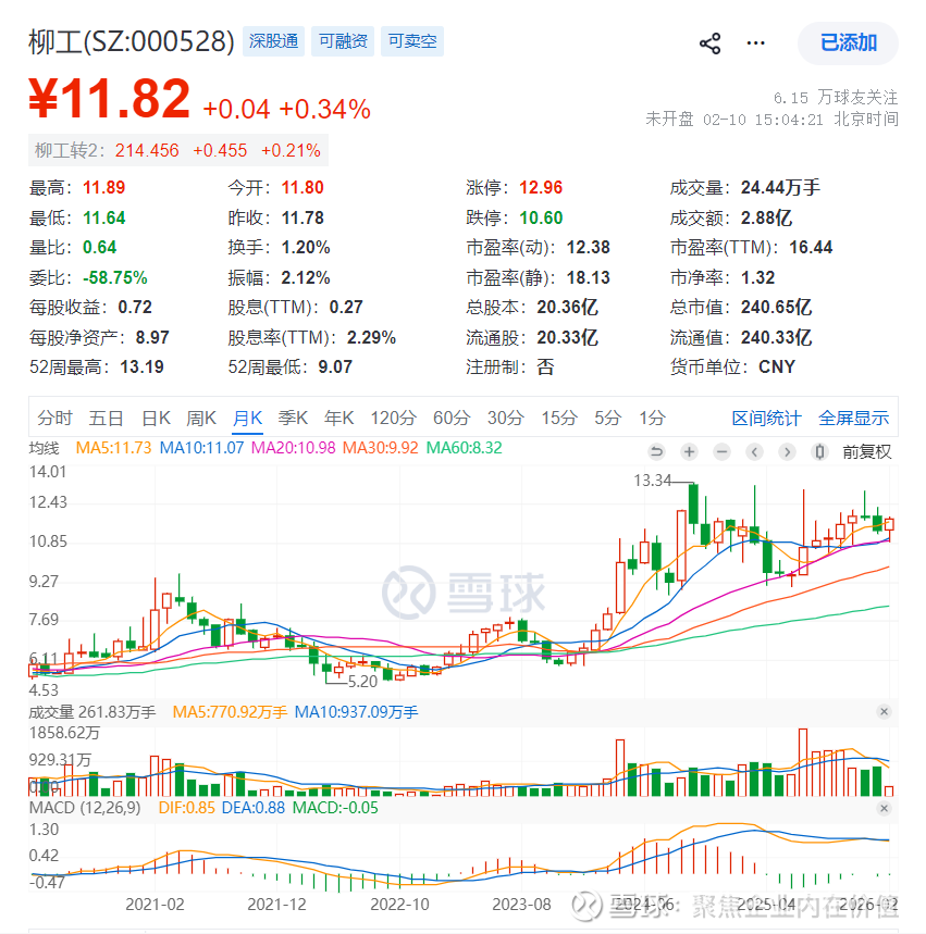 当前是2026年2月11日,柳工的股价是11.82元,市净率1.32倍,市值240.65亿元。
