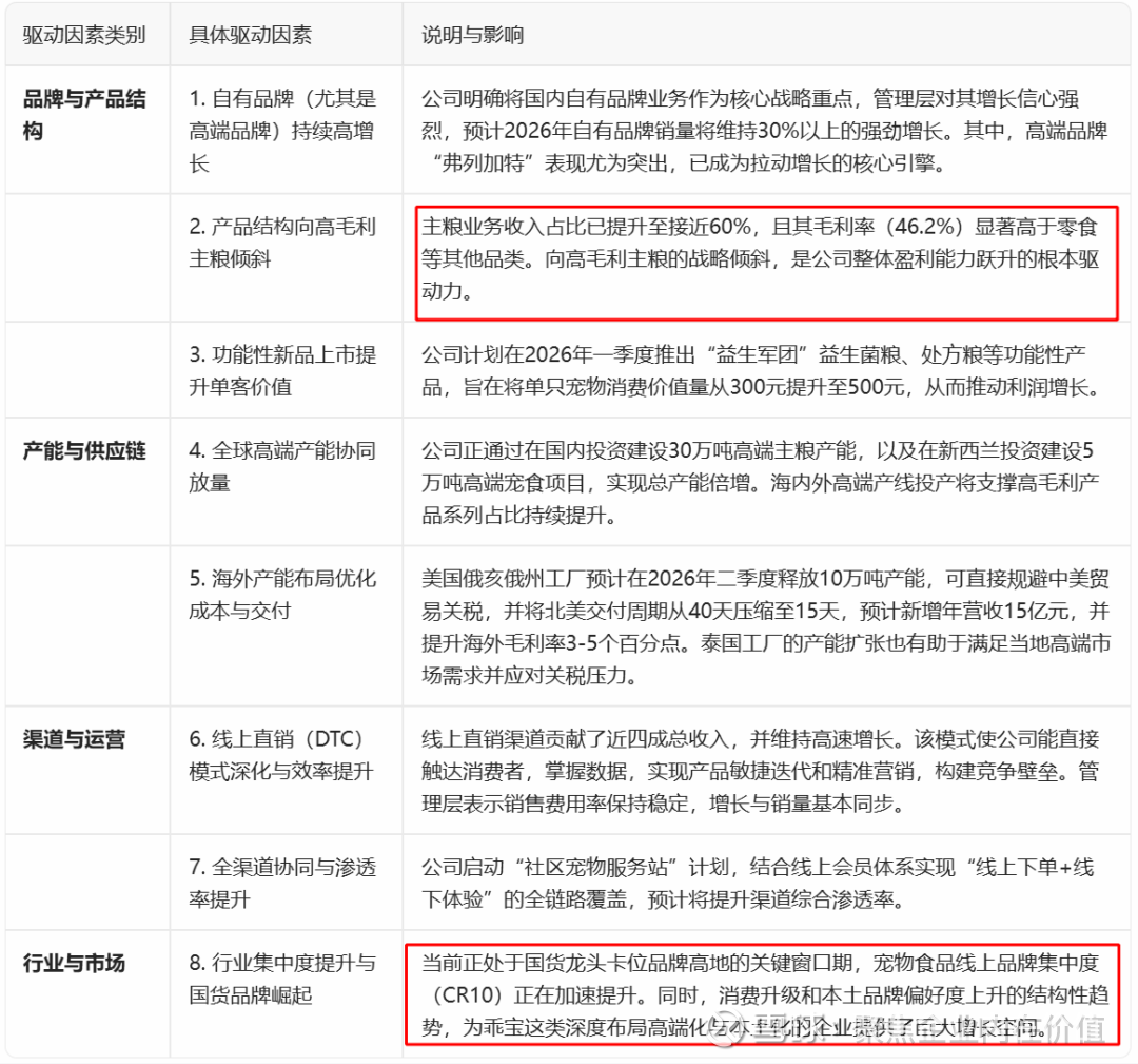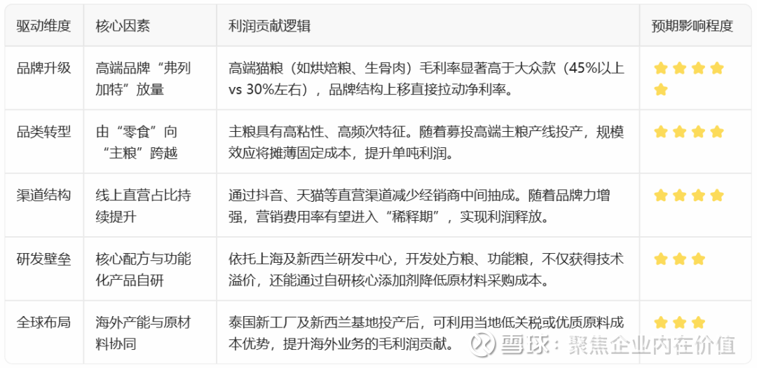 在宠物经济高景气与国产替代的结构性机遇下,公司凭借“高端品牌放量提毛利”与“全球化产能降本增效”的双轮驱动,实现从“量增长”到“质增长”的跃迁,从而确立其作为国产宠物食品龙头的长期投资价值。