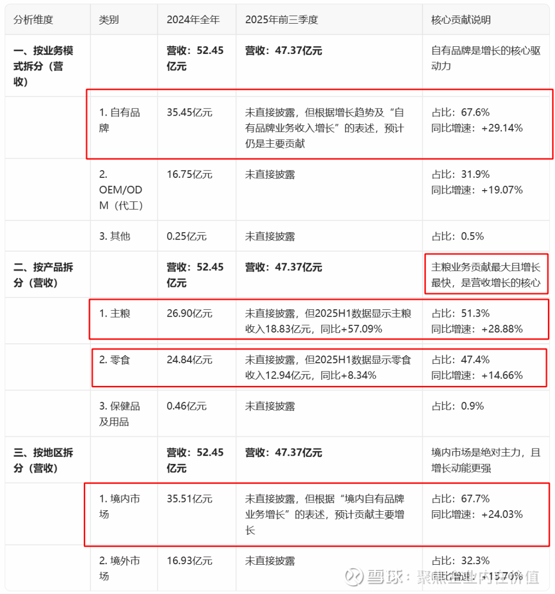 营收核心贡献:自有品牌业务(占2024年营收67.6%)是公司增长的核心引擎,其中主粮产品(占51.3%)又是自有品牌增长的主要驱动力。境内市场(占67.7%)是上述增长实现的主战场。