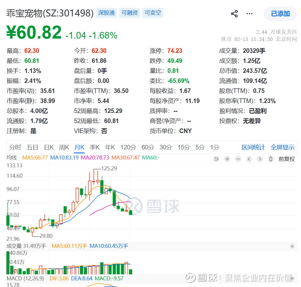 当前是2026年2月21日,乖宝宠物的股价是60.82元,市值是243.57亿元,市净率是5.44倍,市盈率是35.61倍。