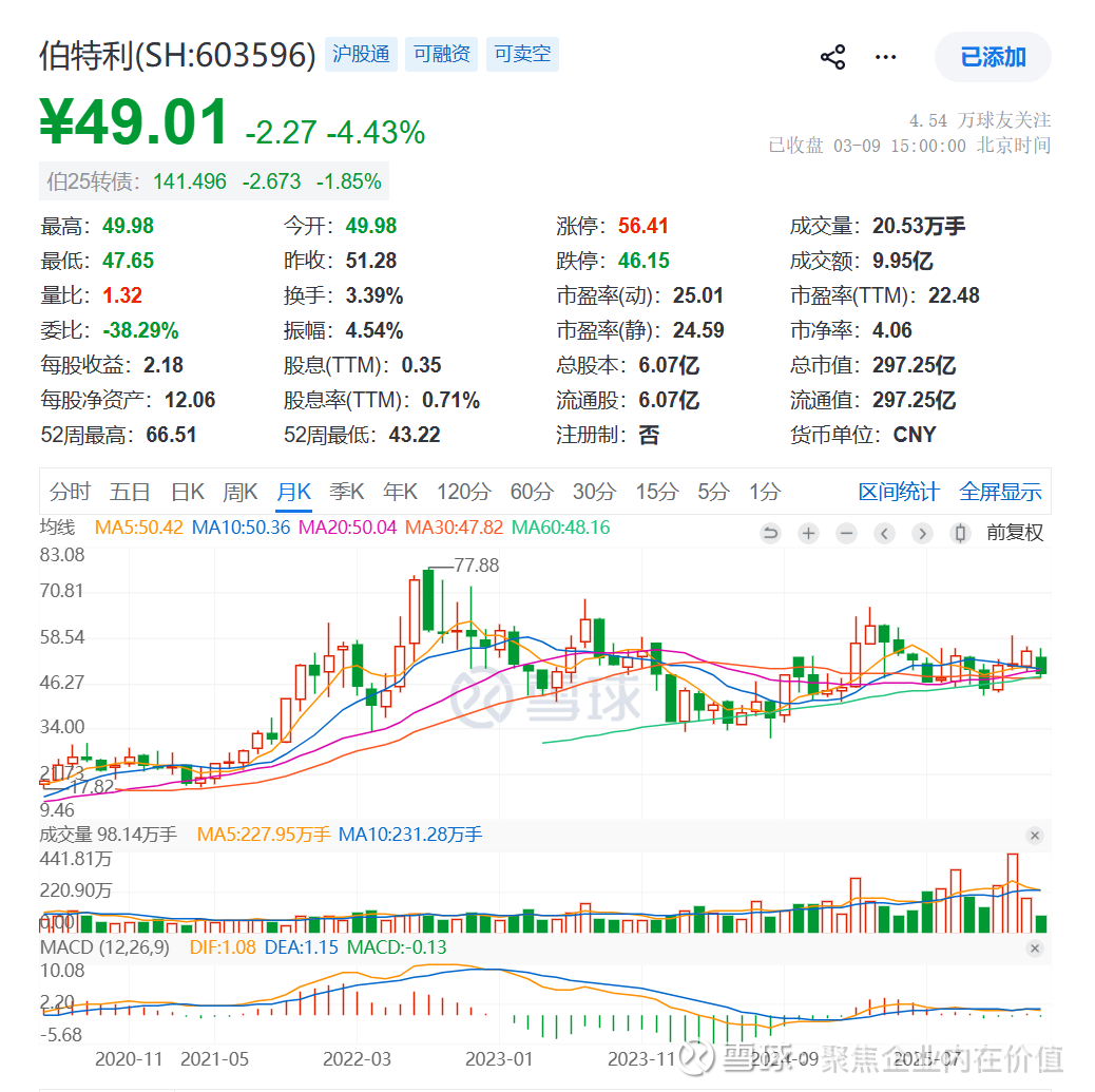 当前是2026年3月9日,伯特利的股价是49.01元,市值是297.25亿,市净率是4.06倍。